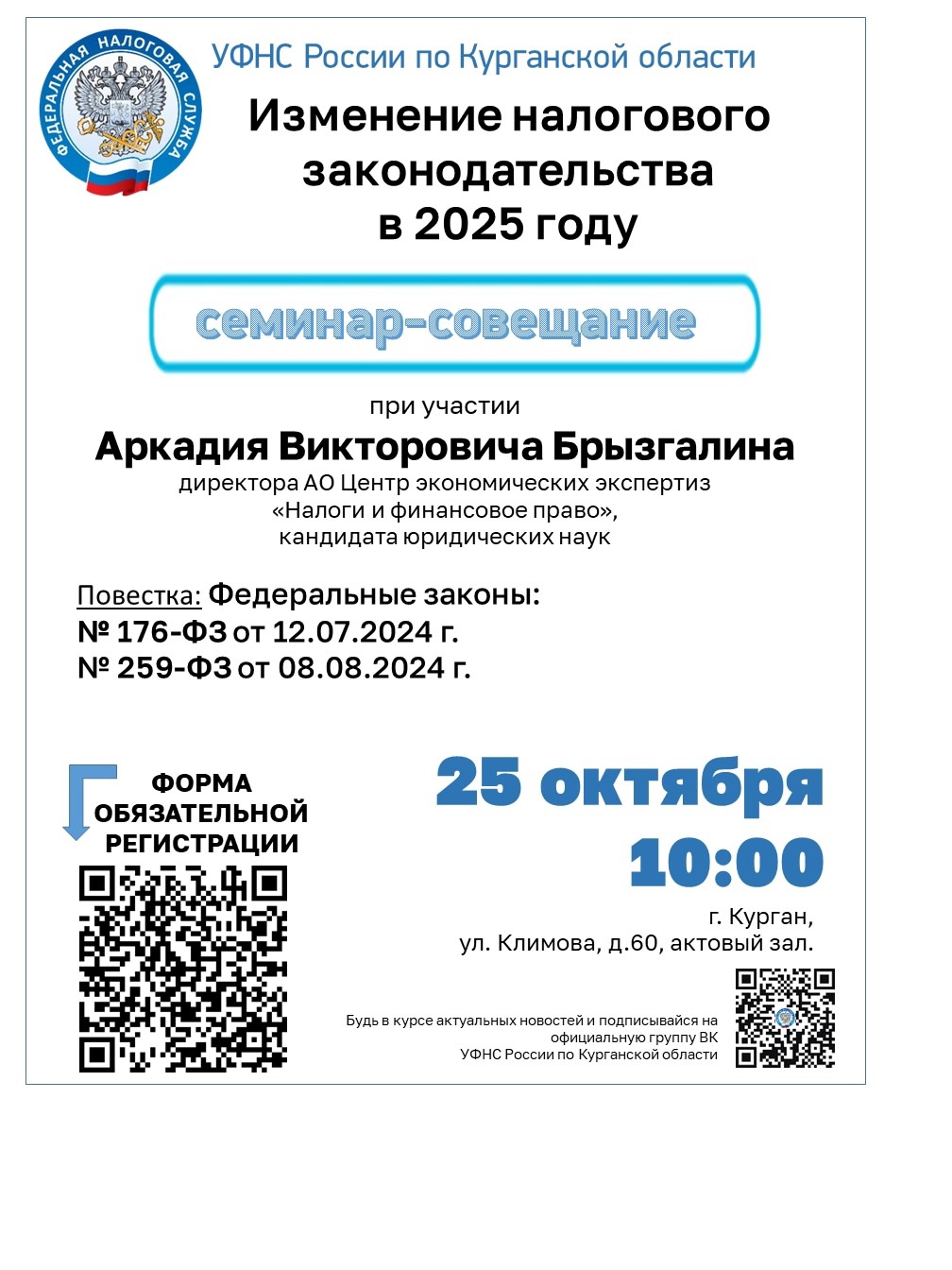 25 октября в 10:00 в г. Курган по адресу ул. Климова, 60 состоится семинар-совещание Изменение законодательства в 2025 году.