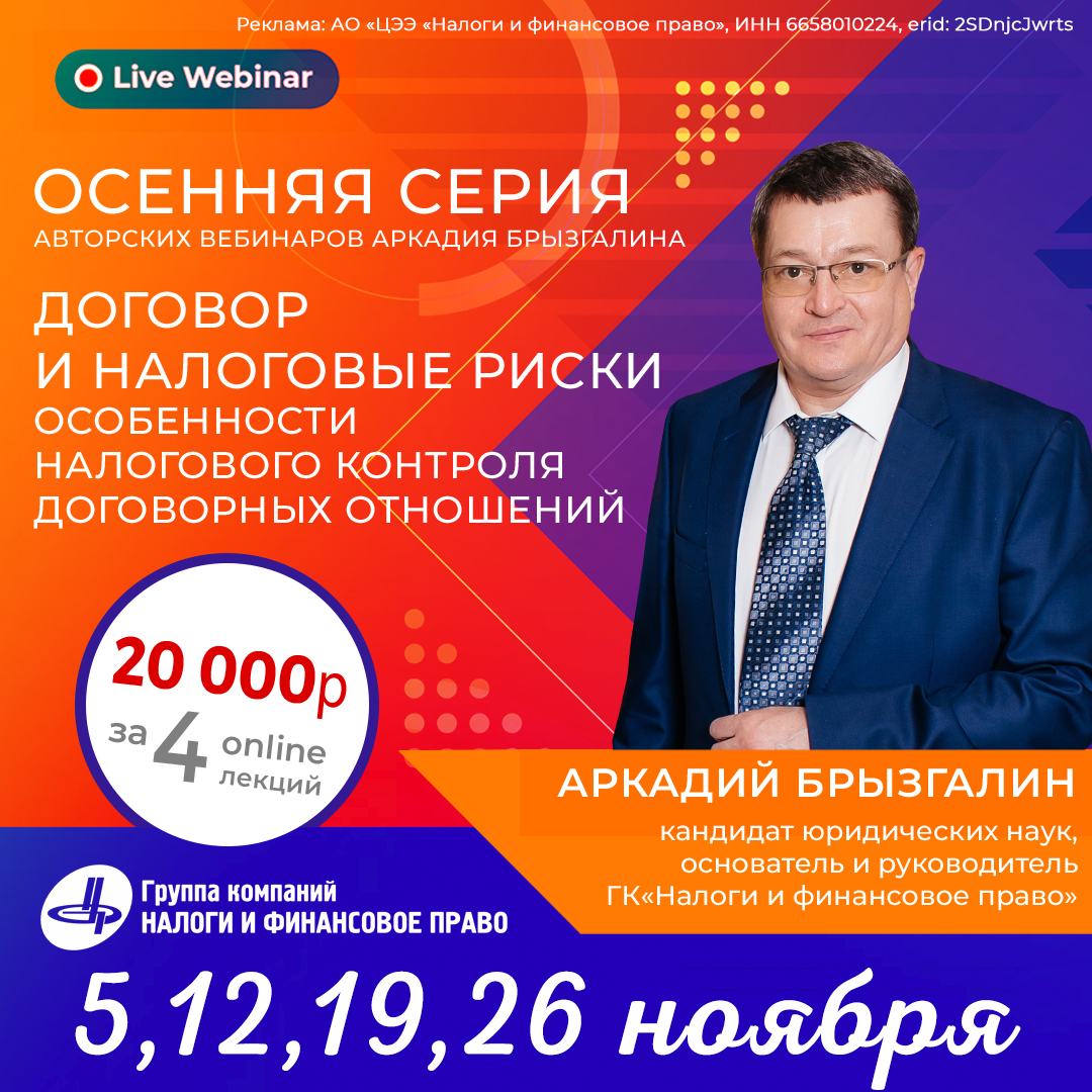 Первый авторский вебинар осенней серии Аркадия Брызгалина: Договор и налоговые риски. Особенности налогового контроля договорных отношений состоится совсем скоро - 5 ноября.