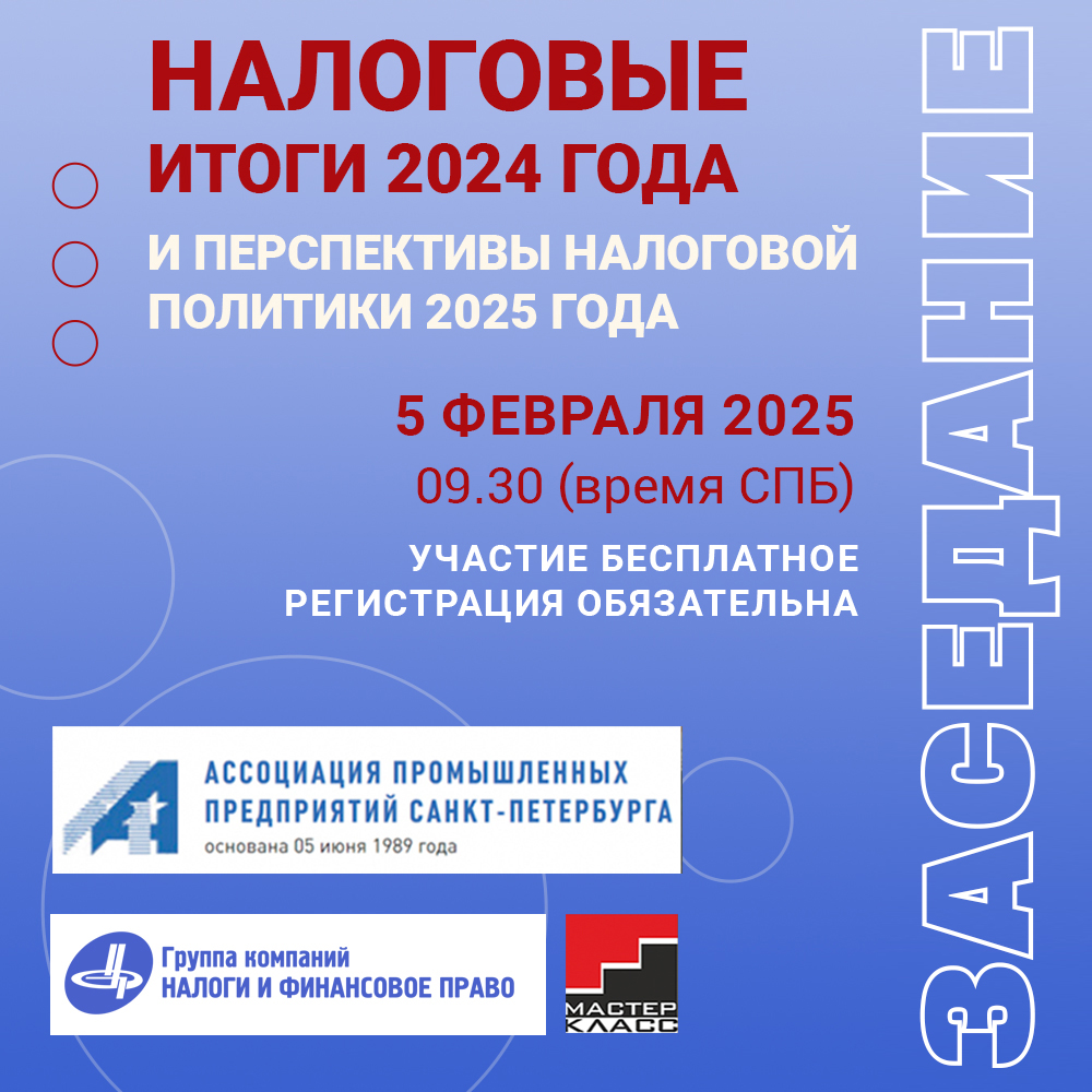 5 февраля в формате дистанционного заседания пройдет Финансово-экономический совет Ассоциации промышленных предприятий Санкт-Петербурга по теме «Налоговые итоги 2024 года и перспективы налоговой политики 2025 года»
