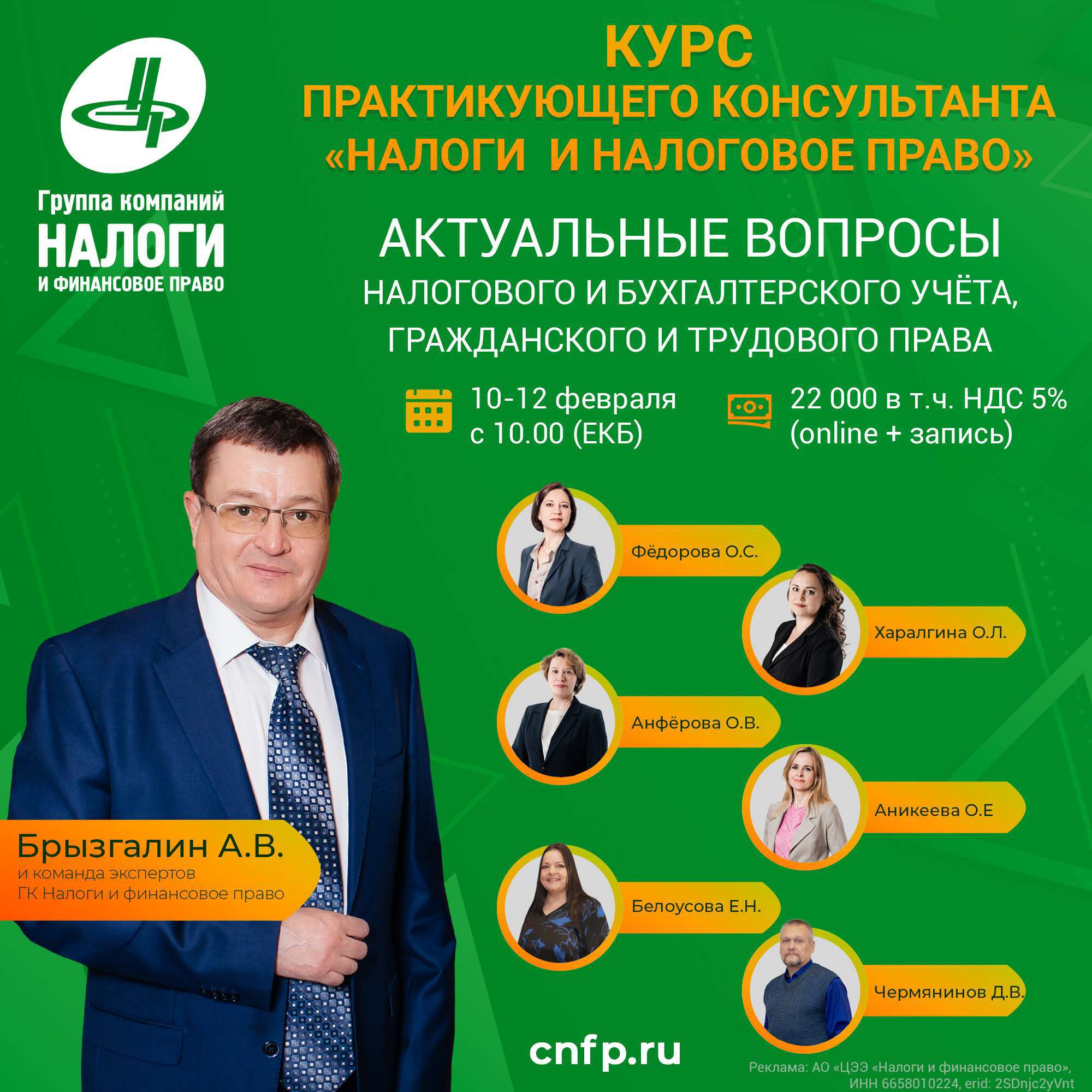 В понедельник 10 февраля стартует зимний Курс практикующего консультанта: «Налоги и налоговое право»: Актуальные вопросы налогового и бухгалтерского учёта, гражданского и трудового права 2025.