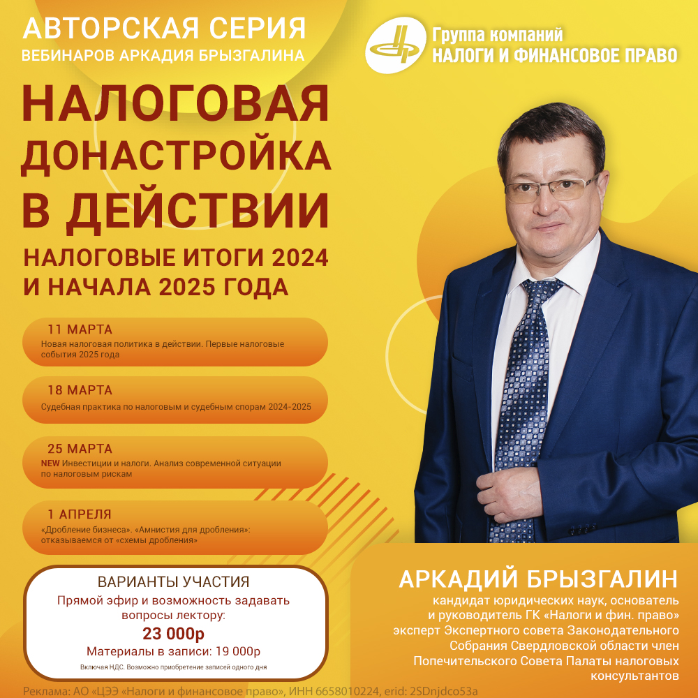 Через неделю начнётся весенняя серия авторских вебинаров А.В. Брызгалина: Налоговая донастройка в действии. Налоговые итоги 2024 и начала 2025 года