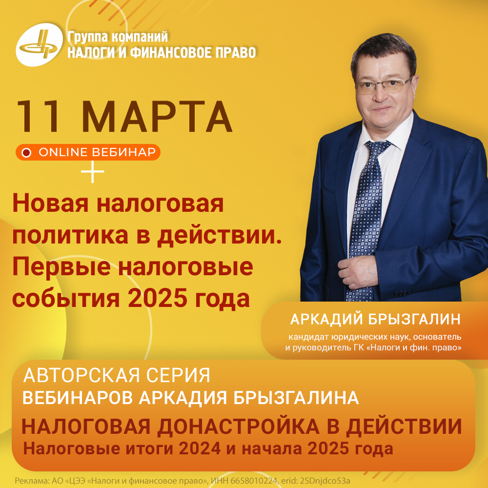 Завтра, 11 марта, стартует весенняя серия авторских вебинаров А.В. Брызгалина: Налоговая донастройка в действии. Налоговые итоги 2024 и начала 2025 года.