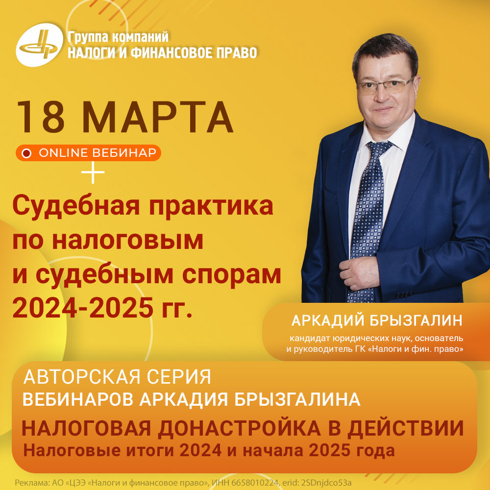 Завтра, 18 марта, состоится второй вебинар весенней серии авторских вебинаров А.В. Брызгалина: Налоговая донастройка в действии. Налоговые итоги 2024 и начала 2025 года.