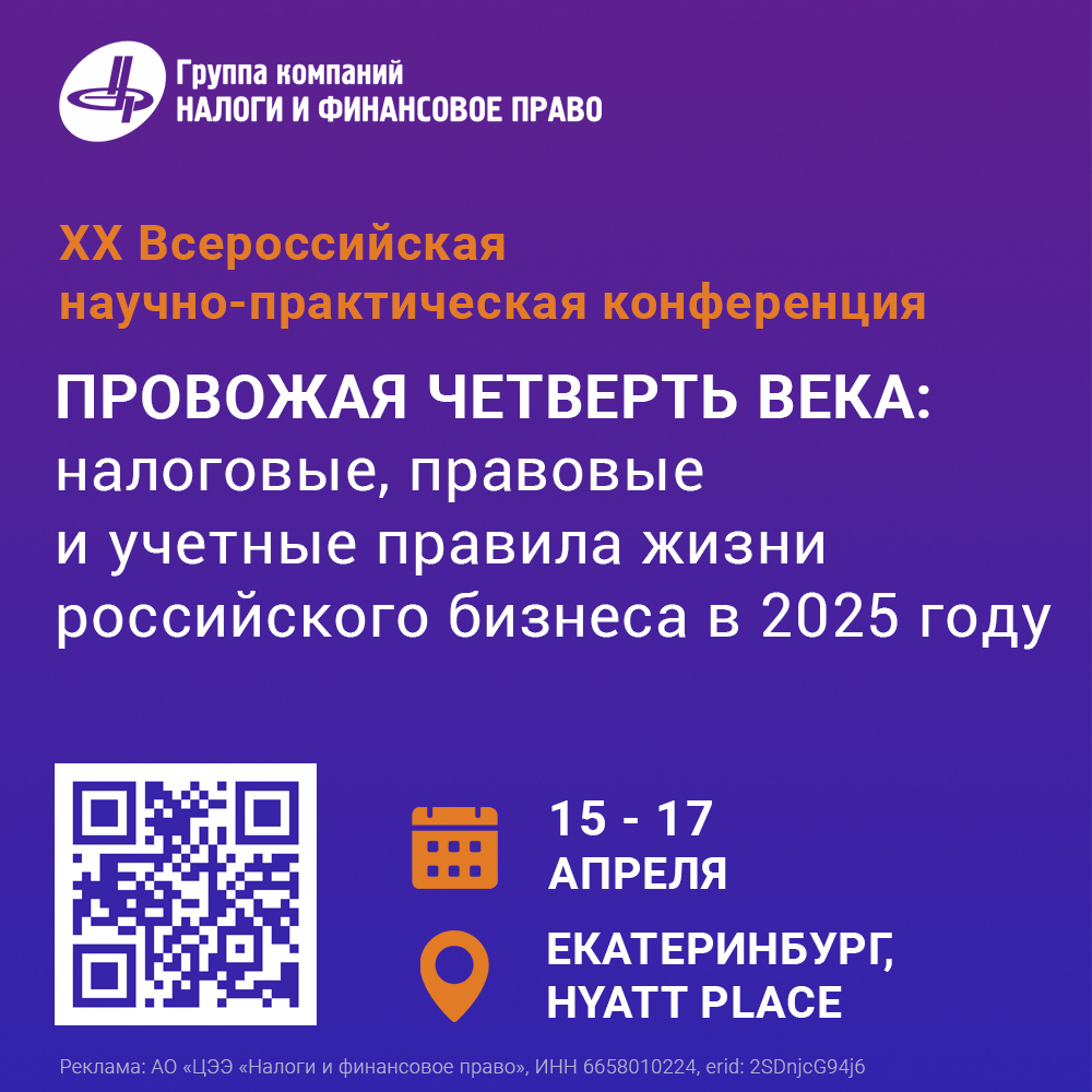 С 15 по 17 апреля в Екатеринбурге пройдет XX Всероссийская Научно-Практическая конференция «Провожая четверть века: налоговые, правовые и учетные правила жизни российского бизнеса в 2025 году».