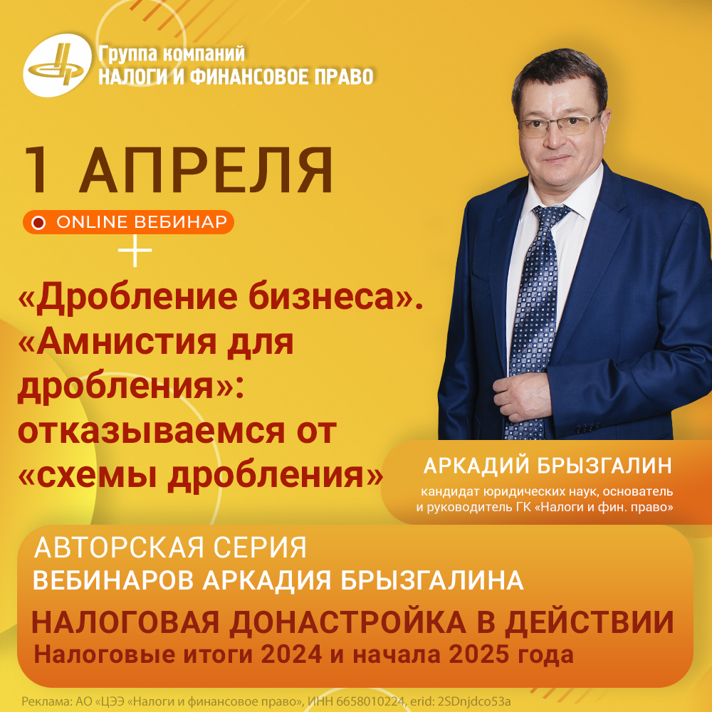 Завтра, 1 апреля, состоится второй вебинар весенней серии авторских вебинаров А.В. Брызгалина: Налоговая донастройка в действии. Налоговые итоги 2024 и начала 2025 года.