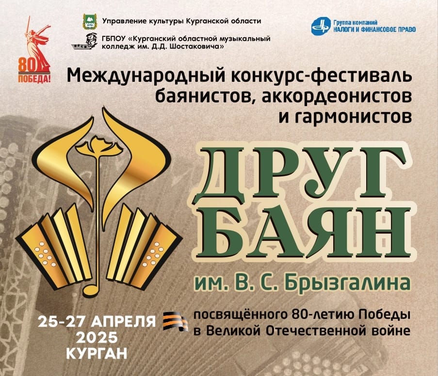 В Курганском областном музыкальном колледже имени Дмитрия Шостаковича в конце апреля пройдет VIII Международный конкурс-фестиваль баянистов, аккордеонистов и гармонистов «Друг баян» имени Виктора Степановича Брызгалина (папы Аркадия Викторовича Брызгалина).