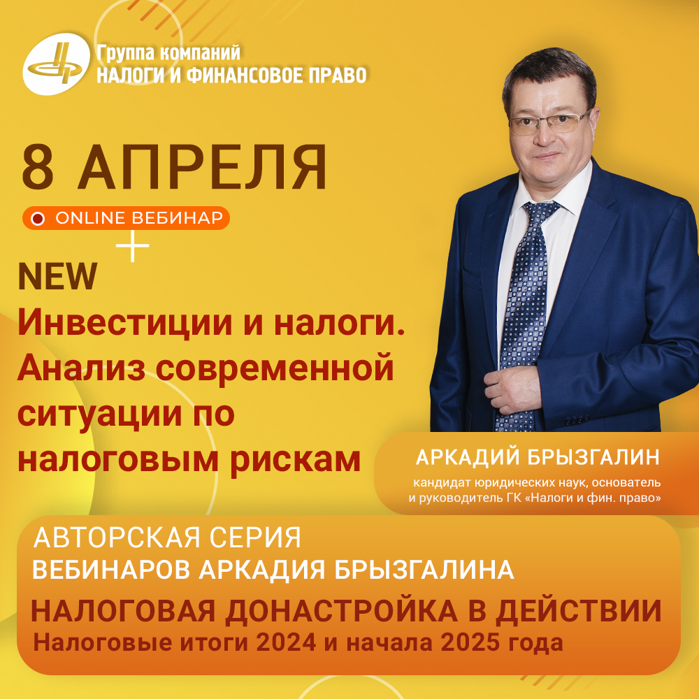 Завтра, 8 апреля, состоится заключительный, четвертый, вебинар весенней серии авторских вебинаров А.В. Брызгалина: Налоговая донастройка в действии. Налоговые итоги 2024 и начала 2025 года.