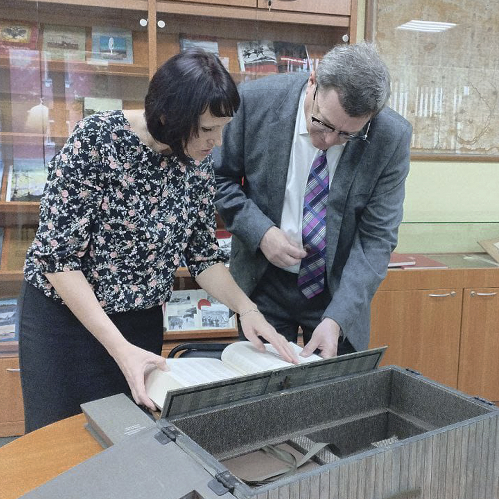 Затем ведущий библиотекарь, Юлия Шмакова познакомила гостя библиотеки с уникальными книгами фонда «Возрождение Тобольска». Вниманию Аркадия Викторовича были представлены редкие книги. Особый интерес вызвали: факсимильное издание «Евангелие Ф. М. Достоевского», факсимиле авторской рукописи сказки «Конёк – Горбунок» П. П. Ершова, репринтное издание «Чертежной книги Сибири», созданная в 1701 г. тобольским исследователем Сибири Семеном Ремезовым.