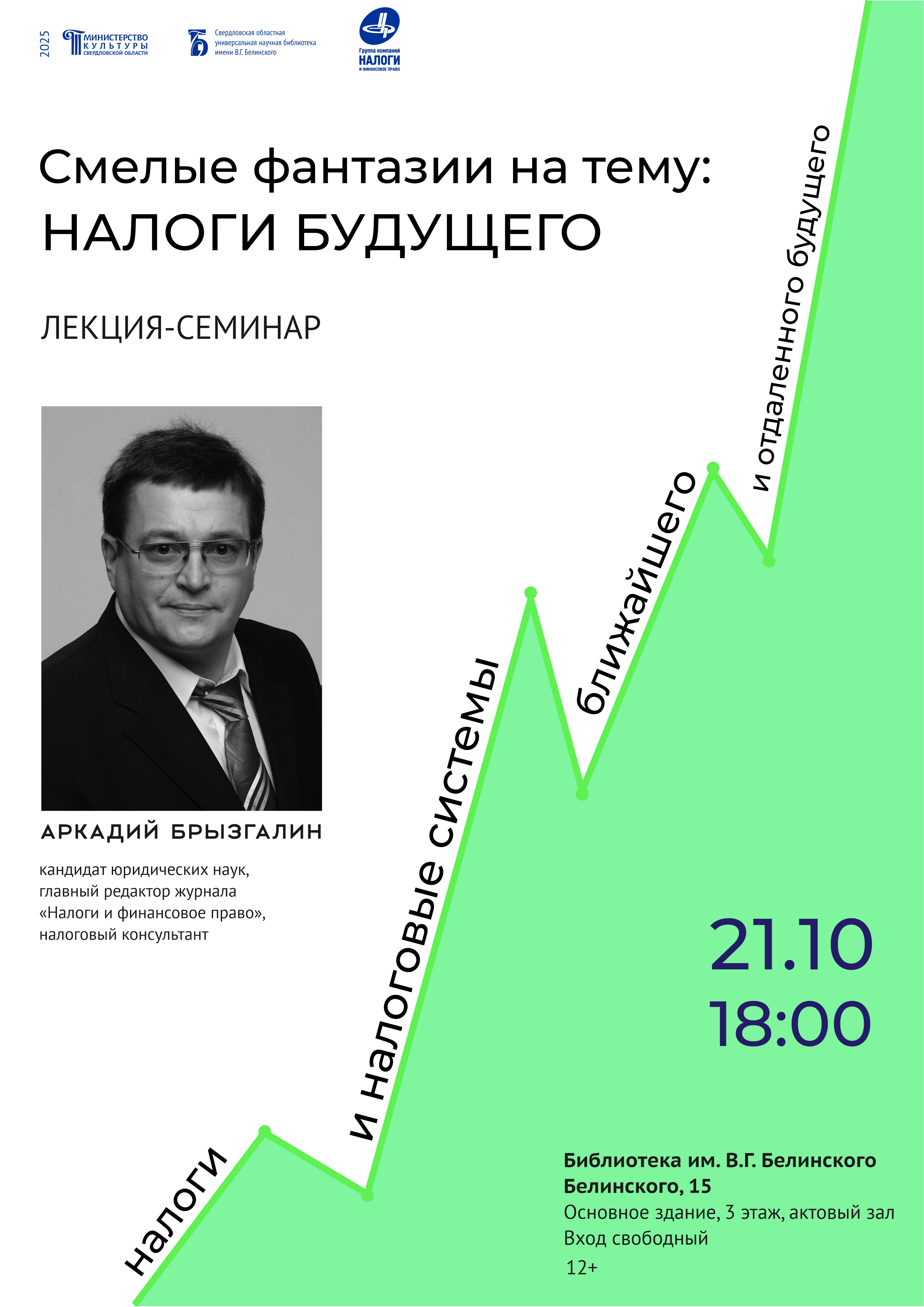 Друзья, совсем скоро, 21 октября Аркадий Викторович Брызгалин прочитает свою новую лекцию: Налоги будущего. Смелые фантазии на тему, какими будут налоги и налоговые системы ближайшего и отдаленного будущего.