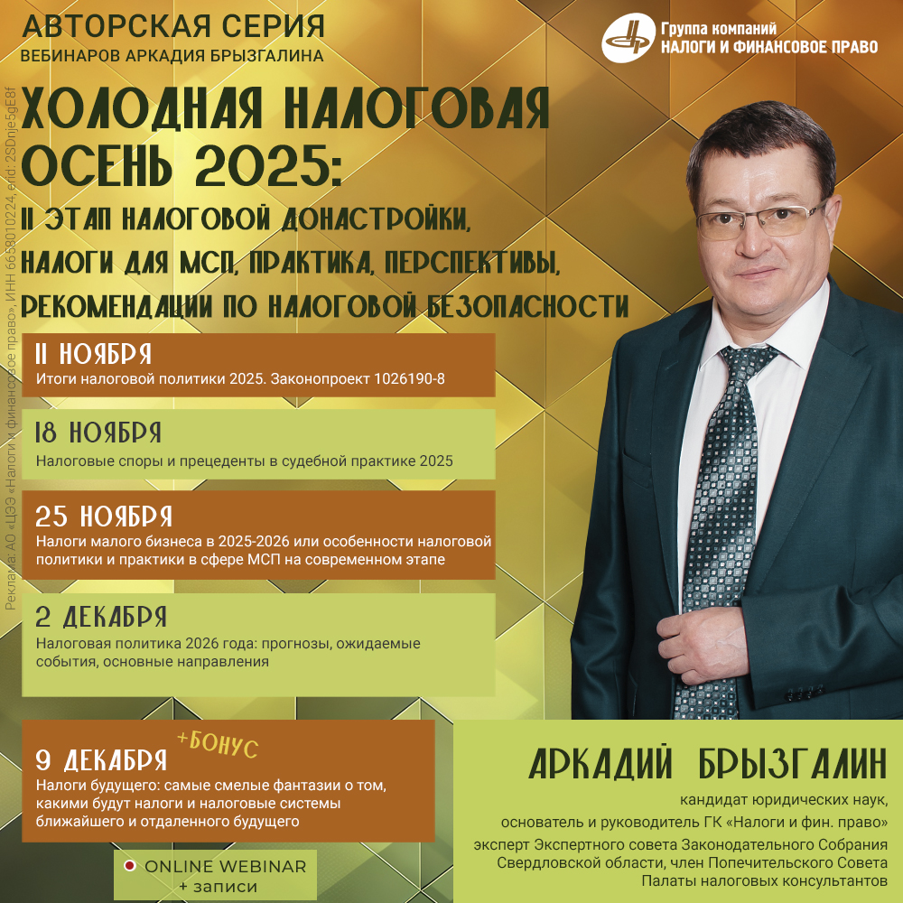 Приглашаем вас на осеннюю серию авторских вебинаров Аркадия Викторовича Брызгалина: «Холодная налоговая осень 2025 года»: Второй этап «налоговой донастройки», жёсткие налоги для МСП, практика, перспективы, рекомендации по налоговой безопасности.