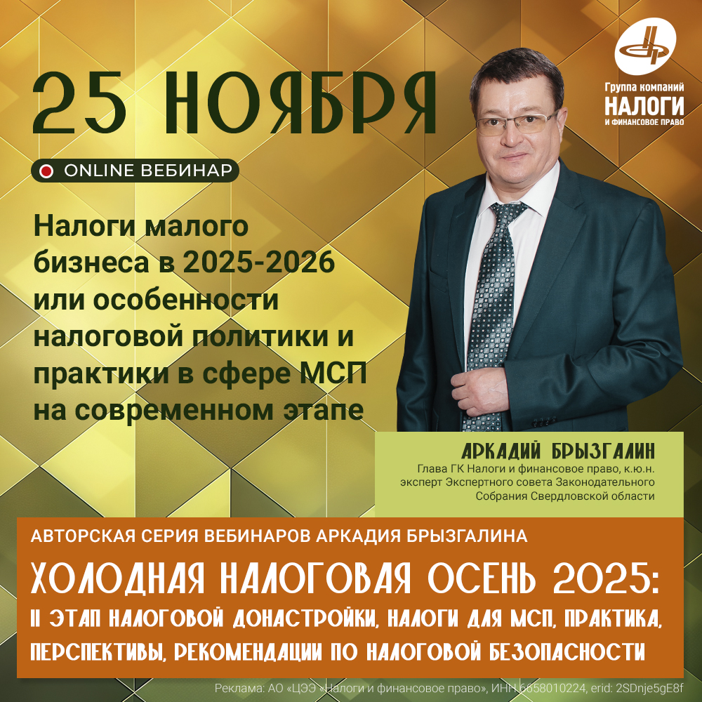 Завтра, 25 ноября, в рамках второго дня осенней серии авторских вебинаров А.В. Брызгалина: «Холодная налоговая осень 2025 года»: Второй этап «налоговой донастройки», жёсткие налоги для МСП, практика, перспективы, рекомендации по налоговой безопасности автор рассмотрит тему: Налоги малого бизнеса в 2025-2026 гг. или особенности налоговой политики и практики в сфере МСП на современном этапе