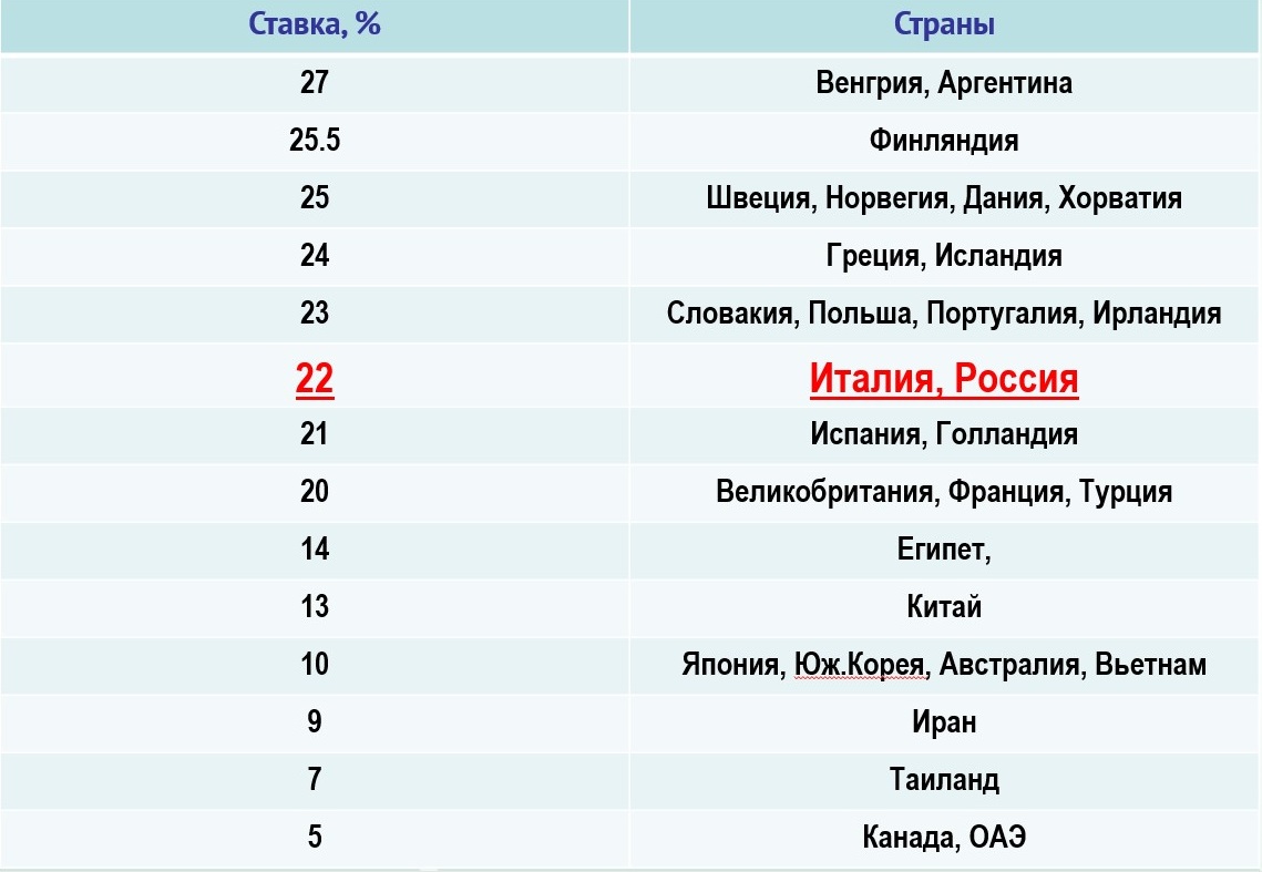Теперь же с учетом общей ставки НДС в 22% Россия вошла в мировой рейтинг стран с самой высокой ставкой этого налога (После возможного повышения НДС с 20 до 22% Россия войдёт в топ-5 стран мира с самым высоким НДС):