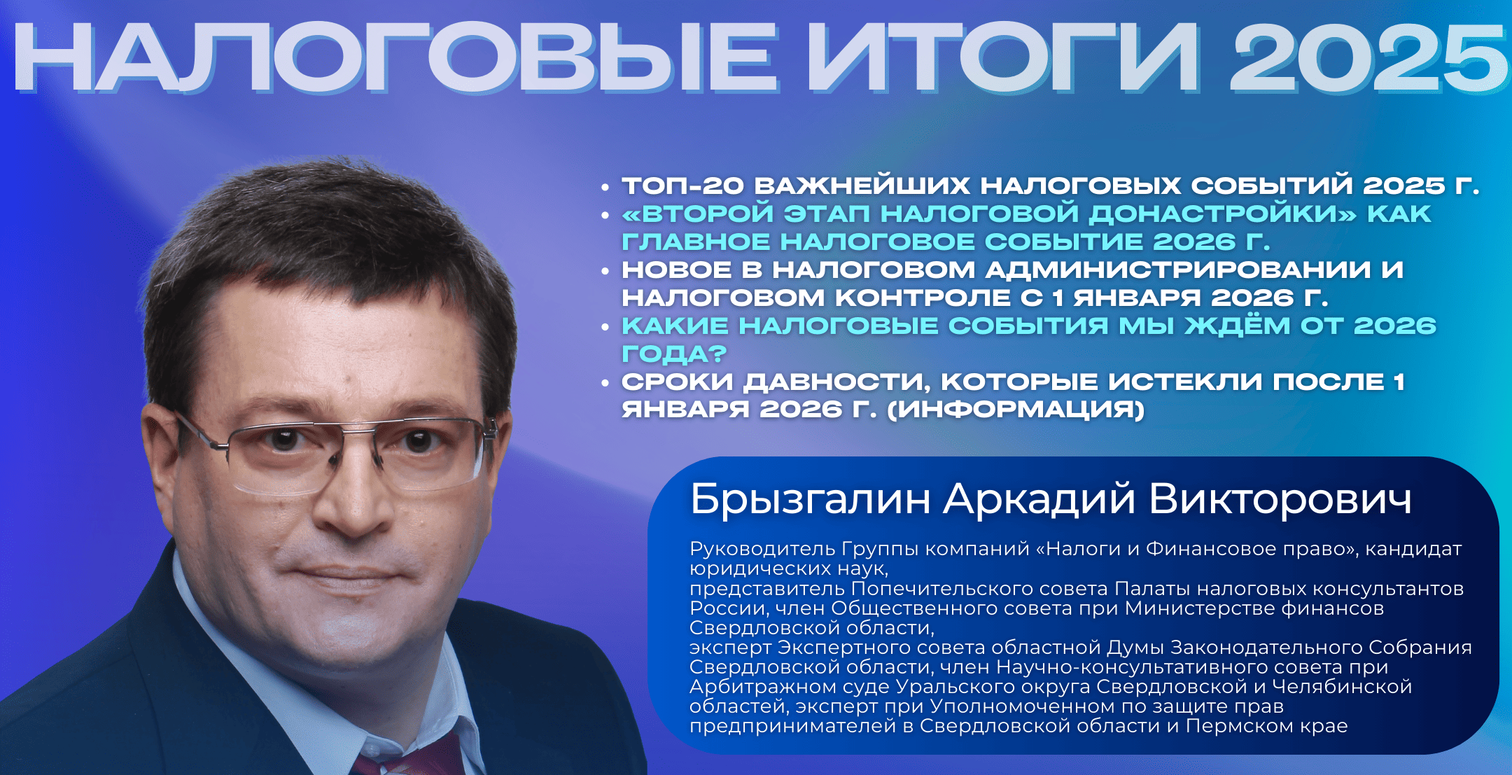 Центральным событием заседания стал доклад руководителя ГК «Налоги и финансовое право» Аркадия Викторовича Брызгалина. Эксперт представил обзор важнейших налоговых событий 2025 года, рассмотрел нововведения в налоговом администрировании и налоговом контроле с 1 января 2026 года, сделал прогноз ключевых налоговых событий на 2026 год и рассказал о сроках давности, которые истекли после 1 января 2026 года.
