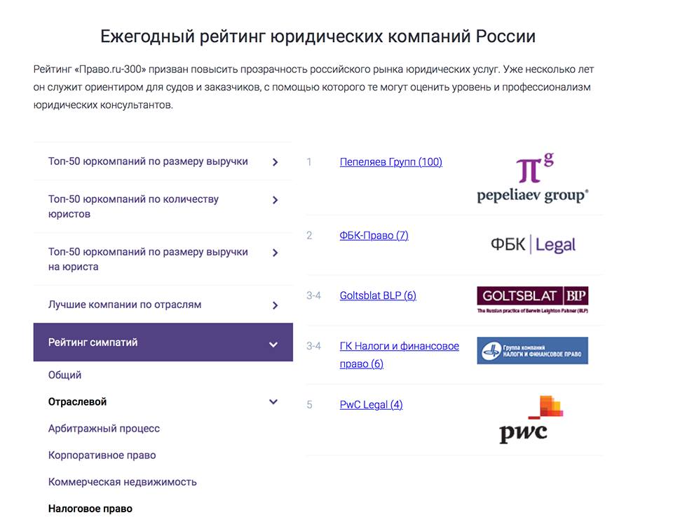 Группа компаний "Налоги и финансовое право" заняла 3(4) место в рейтинге юридических компаний России по версии портала "Право.ru-300" (категория "налоговое право", рейтинг симпатий).