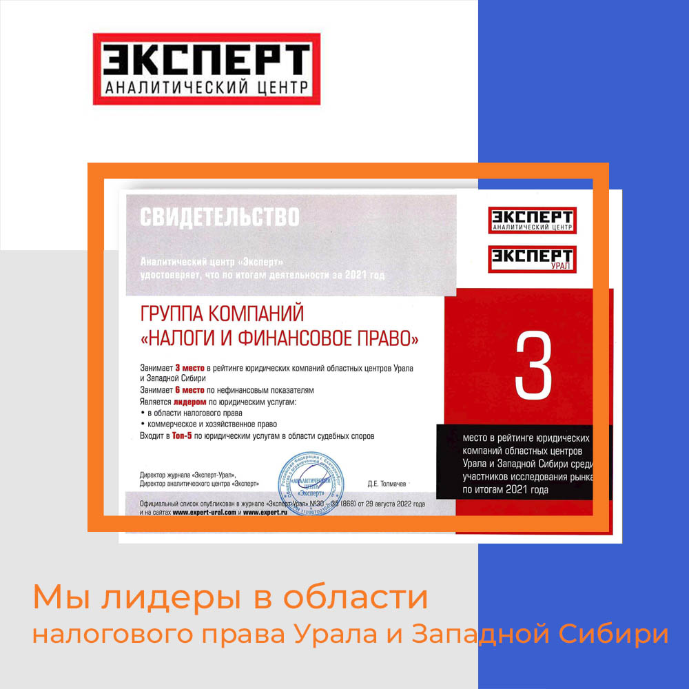 В свежих выпусках журналов «Эксперт-Урал» №№ 30-35 от 29 августа-11 сентября размещены рейтинги юридических компаний областных центров Урала и Западной Сибири по итогам 2021 года.Группа компаний «Налоги и финансовое право» стабильно занимает верхнюю строчку среди компаний, оказывающих юридические услуги в области налогового, коммерческого и хозяйственного права. Нам принадлежит третья позиция в общем рейтинге по выручке от оказания юридических услуг. Ключевые области компетенции компании - налоговое право и судебные споры, входящие в число востребованных на рынке юридических практик.