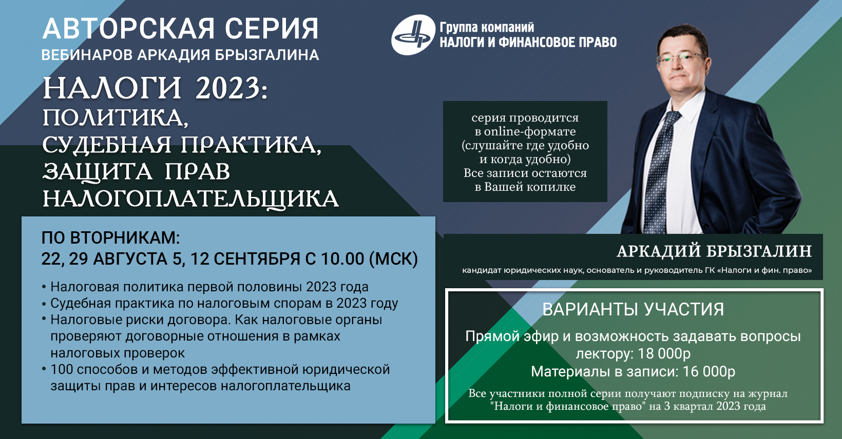 Группа компаний «Налоги и финансовое право» приглашает принять участие в серии авторских вебинаров Аркадия Брызгалина: Налоги 2023: политика, судебная практика, защита прав и интересов налогоплательщика.
