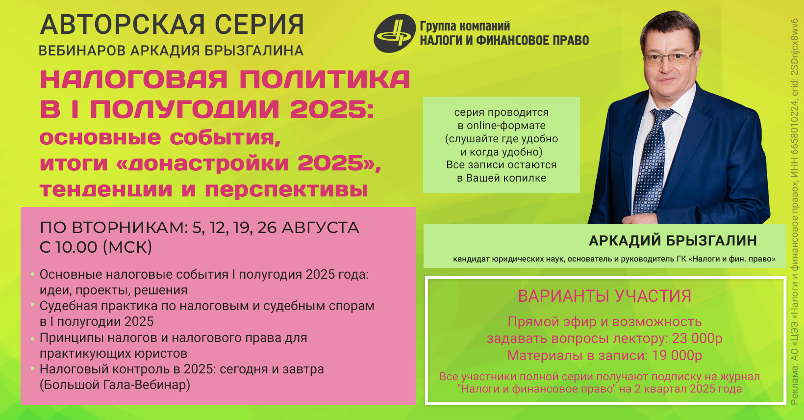 Группа компаний «Налоги и финансовое право» приглашает принять участие в серии авторских вебинаров Аркадия Викторовича Брызгалина: Налоговая политика в I полугодии 2025 года: основные события, итоги «донастройки 2025», тенденции и перспективы.