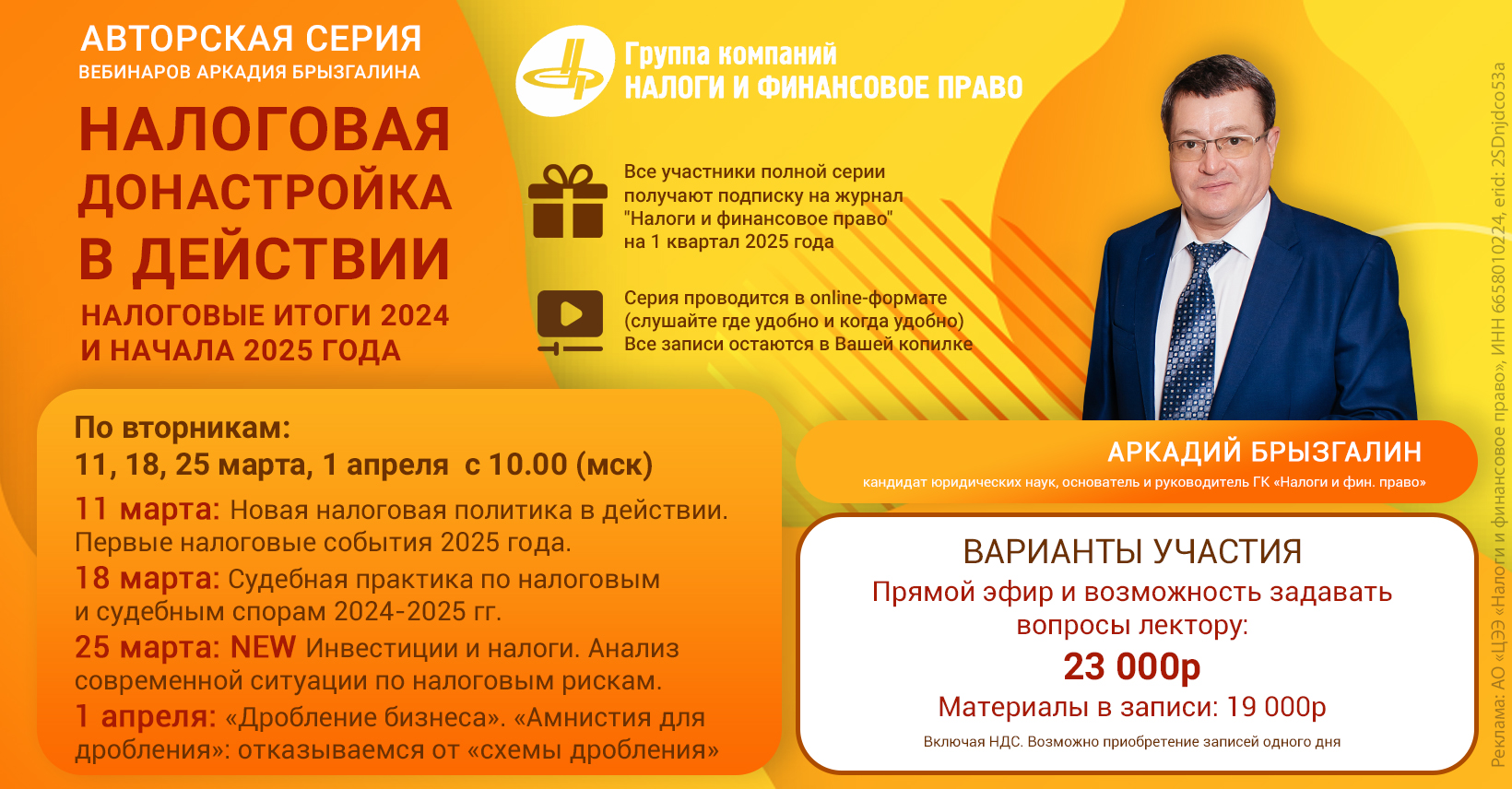 Группа компаний «Налоги и финансовое право» приглашает принять участие в серии авторских вебинаров Аркадия Викторовича Брызгалина: Налоговая донастройка в действии. Налоговые итоги 2024 и начала 2025 года.