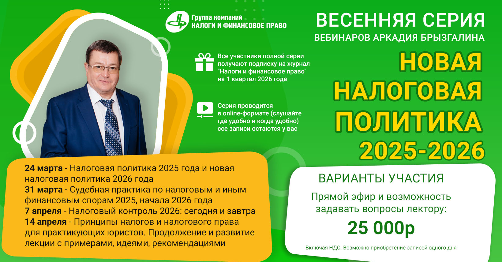Группа компаний «Налоги и финансовое право» приглашает принять участие в серии авторских вебинаров Аркадия Викторовича Брызгалина: Новая налоговая политика 2025-2026.