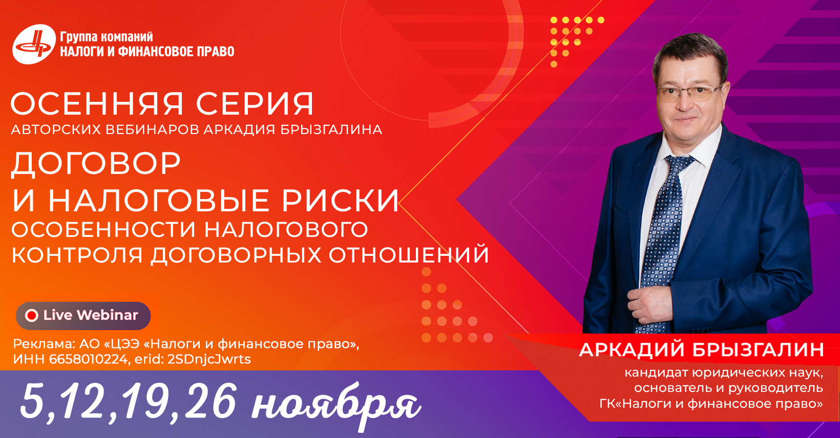 Группа компаний «Налоги и финансовое право» приглашает принять участие в серии авторских вебинаров Аркадия Брызгалина: Договор и налоговые риски. Особенности налогового контроля договорных отношений.