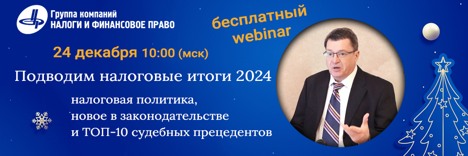 Группа компаний «Налоги и финансовое право» приглашает принять участие в вебинаре Аркадия Викторовича Брызгалина: Подводим налоговые итоги 2024 года: налоговая политика, новое в законодательстве, судебная практика по налоговым спорам, который запланирован на 24 декабря (вторник).