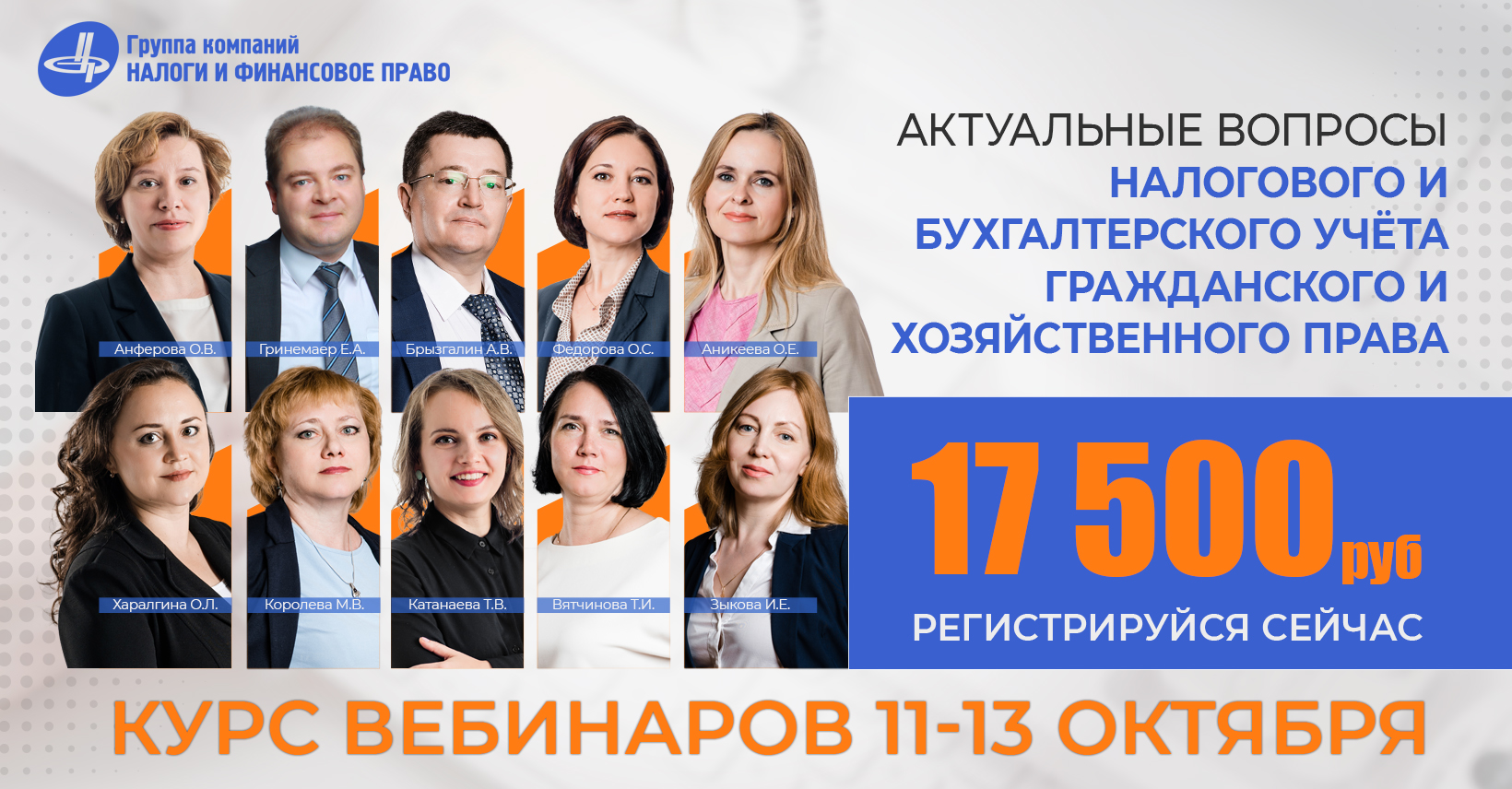 Группа компаний "Налоги и финансовое право" приглашает принять участие в осеннем курсе: Актуальные вопросы налогового и бухгалтерского учёта, гражданского и хозяйственного права. В этой сессии рассмотрим самые свежие темы, дадим ответы на вопросы налогового и бухгалтерского учёта, трудового, гражданского и хозяйственного права в свете новых ФСБУ и не только.