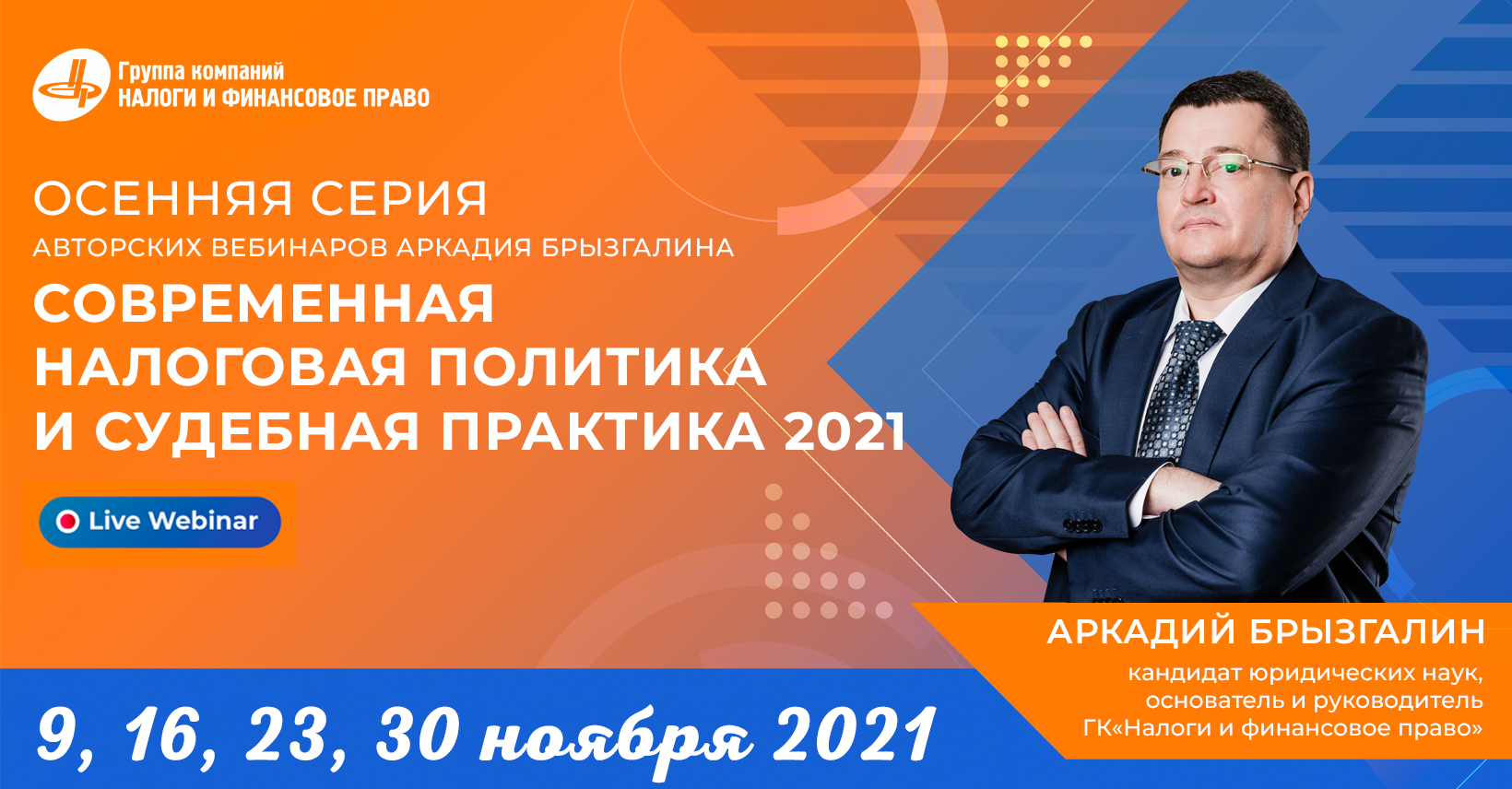 Группа компаний "Налоги и финансовое право" приглашает принять участие в осенней серии авторских вебинаров Аркадия Брызгалина: Современная налоговая политика и судебная практика 2021 года.