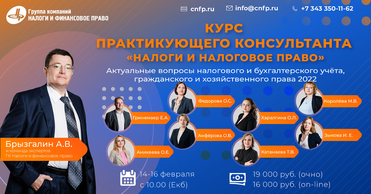 Группа компаний «Налоги и финансовое право» приглашает принять участие в зимней сессии Курс практикующего консультанта: «Налоги и налоговое право»: Актуальные вопросы налогового и бухгалтерского учёта, гражданского и хозяйственного права. В этой сессии рассмотрим самые свежие темы, дадим ответы на вопросы налогового и бухгалтерского учёта, трудового, гражданского и хозяйственного права в свете новых ФСБУ и не только.