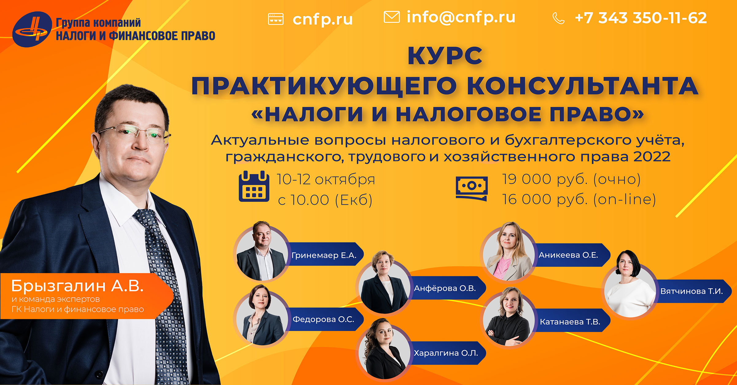 Группа компаний «Налоги и финансовое право» приглашает принять участие в осеннем Курсе практикующего консультанта: «Налоги и налоговое право»: Актуальные вопросы налогового и бухгалтерского учёта, гражданского, трудового и хозяйственного права. В этой сессии рассмотрим самые свежие темы, дадим ответы на вопросы налогового и бухгалтерского учёта, трудового, гражданского и хозяйственного права в свете новых ФСБУ и не только.