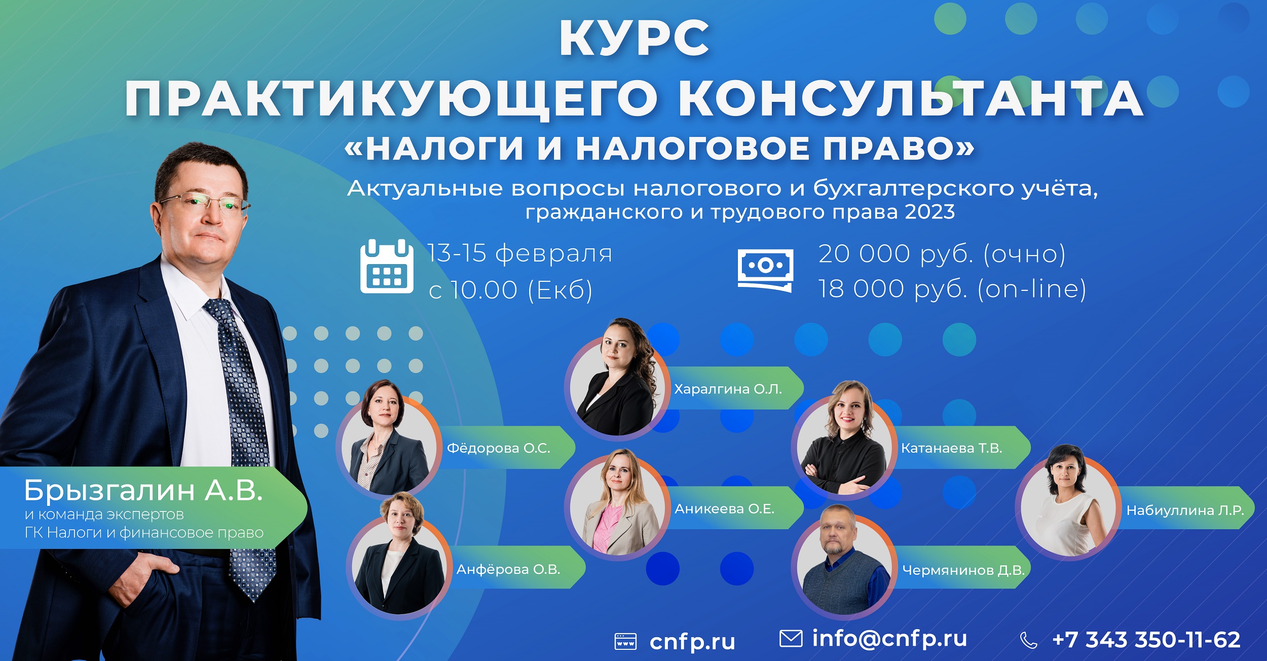 Группа компаний «Налоги и финансовое право» приглашает принять участие в зимней сессии Курс практикующего консультанта: «Налоги и налоговое право»: Актуальные вопросы налогового и бухгалтерского учёта, гражданского и трудового права 2023. В этой сессии рассмотрим самые свежие темы, в том числе единый налоговый счет и единый налоговый платеж, подготовка и сдача годового отчета 2022, а также дадим ответы на вопросы налогового и бухгалтерского учёта, трудового и гражданского права. Новинка курса: основы оптимизации деятельности участника ВЭД.