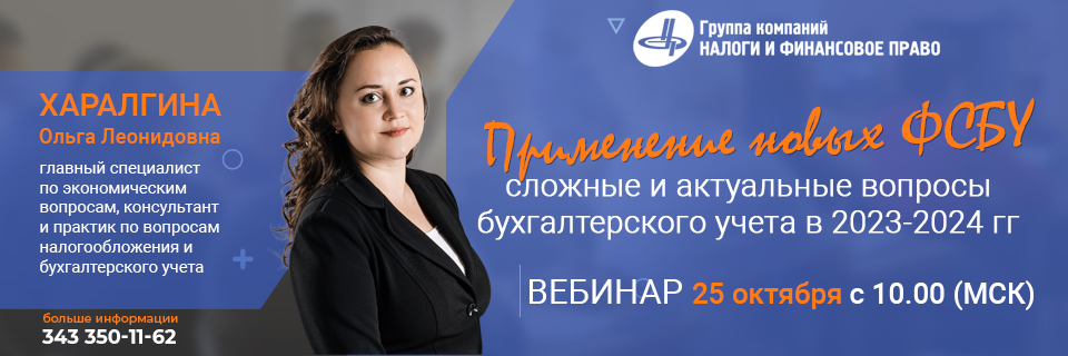 Группа компаний «Налоги и финансовое право» приглашает принять участие в аебинаре Ольги Харалгиной: «Применение новых ФСБУ, сложные и актуальные вопросы бухгалтерского учета в 2023-2024 гг.»