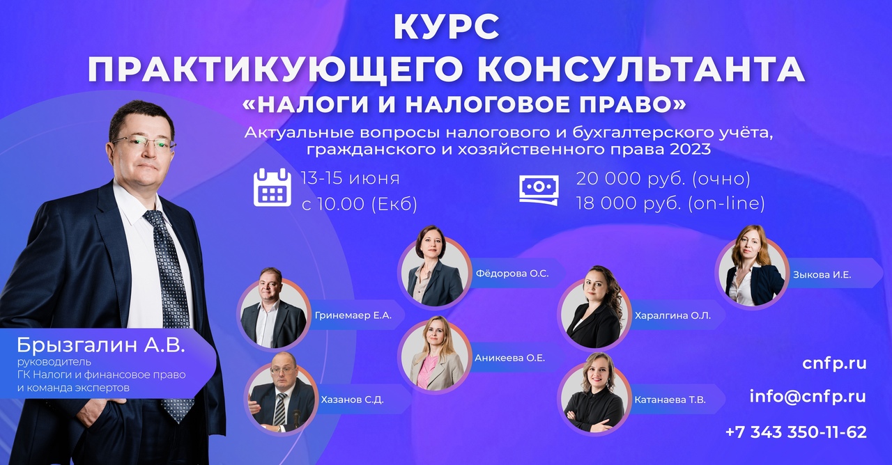 Группа компаний «Налоги и финансовое право» приглашает принять участие в летней сессии Курса практикующего консультанта «Налоги и налоговое право»: Актуальные вопросы налогового и бухгалтерского учёта, гражданского и трудового права 2023. В этой сессии рассмотрим самые свежие темы, в том числе вопросы применения ФСБУ, трудовые и налоговые отношения с иностранцами и гражданами РФ, работающими за границей, вопросы административной ответственности в сфере предпринимательской деятельности и многое другое.